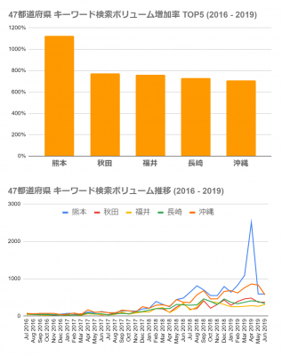 その結果、47都道府県で一番増加率が高かったのは、熊本県、次いで秋田県となりました。熊本県では、2017年秋に熊本発のeスポーツチームが発足するなど、関心の高まりが伺えます。TOP5にランクインしているのはすべて首都圏から一定の距離が離れている地方県となっているのが特徴的といえます。ボリュームの推移をみると、ボリューム数が増加している時期が各県ともに共通していることが多いのがわかります。2018年2月に日本eスポーツリーグが開幕したり、2018年9月にはアジア競技大会が開催されたり、2018年12月には有名タイトルの世界大会が行われたりと、大きな大会が開催される時期に検索ボリュームが増えていることがわかりました。