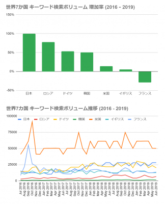 世界でのeスポーツに対する関心度を調査するため、主要国7カ国を選び、「eスポーツ」のキーワード検索ボリュームの2016年〜2019年の増加率と、検索ボリュームの推移を調べました。