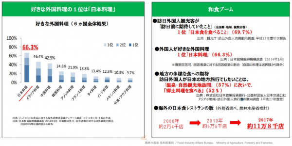 2013年「和食」が無形世界文化遺産に登録されました。外国人の好きな外国料理の1位にも「日本料理」が選ばれています。また、訪日外国人観光客の約7割の方々が「日本食を食べること」を楽しみに来日されているようです。日本人だけでなく海外の方々からも支持されている日本料理の発展の中から「お茶」の文化が生まれました。そのため日本料理とお茶の相性は良く、食事と「宇治抹茶ハイ」を通して日本の味を楽しんでいただけます。