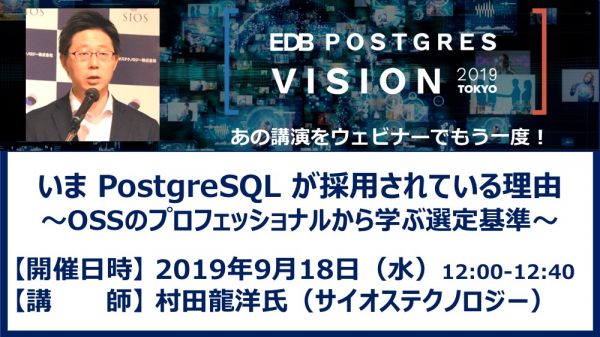 EDBは国内パートナー、サイオステクノロジー村田龍洋氏を講師に「いま PostgreSQL が採用されている理由」と題するウェビナーを2019年9月18日ランチタイムに開催いたします。