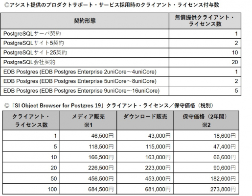 EDB Postgresによるミッション・クリティカルな企業システム構築のサポートでも実績があり、同製品の販売代理店を務めるアシストでは、自社からEDB Postgresのサブスクリプションを購入した顧客に対し、「SI Object Browser for Postgres 19」のクライアント・ライセンスを無償で提供します。これにより、EDB Postgresによるシステム構築の負荷軽減/工数削減に大きく貢献し、顧客企業における複数データベースの適材適所での有効活用を支援します。
