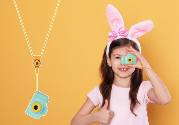 本体サイズ80mm x 60mm x 50mm、重さ73gのコンパクト設計で、小さなお子様でも扱いやすく、かわいいおもちゃのようなデザインはプレゼントにもぴったりです。さらにネックストラップとリストストラップが付属しており、安心して撮影したり、持ち運んだりできます。