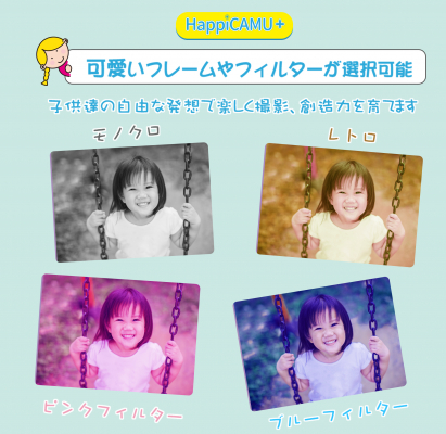 「HappiCAMU PLUS」では、子供用カメラでは初となる高解像度1500万画素レンズを搭載した現行モデル「HappiCAMU」の第二弾として、解像度がさらに強化され、解像度2000万画素のフロントレンズを搭載しています。さらに、解像度2000万画素の自撮り用のレンズも搭載されインカメラ機能が新たに実装されました。現行モデル「HappiCAMU」同様、静止画だけでなく、1080Pビデオも録画することが出来ます。フレームやデコレーションといった効果も盛りだくさんで、小さなお子様でも楽しみながら高品質のカメラを体験することができます。カラーは従来のピンクとブルーに、新色のグリーンを加えた、全3色で展開いたします。