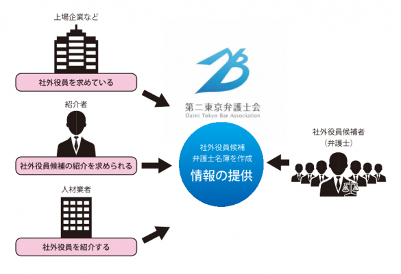 近年、増加する企業の不祥事問題の原因となるコンプライアンス対策が急務となる一方で、スキルや経験をもつ社外役員の確保が十分ではない状況です。そこで、第二東京弁護士会では所属する会員弁護士の情報を整理し、求められる適切な人材の情報を無償で提供しております。