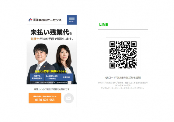 (1) スマートフォンから、オーセンスの残業代請求サイト(https://roudou.authense.jp/)にアクセスし、「LINEでお悩み診断」ボタンから「友だち追加」します。パソコンの場合は、ウェブサイト左下に表示されるQRコードをスマートフォンのカメラで読み取り、「友だち追加」します。