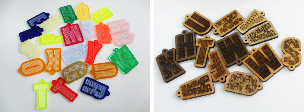 グラフィックソフトのイラストレーター(Adobe Illustrator)でレリーフ模様のテンプレートデザインを操作し、TechShopに設置されているトロテック・レーザーカッターを使って、材料のアクリルや木材を加工してレリーフ彫刻のキーホルダーを作ります。
