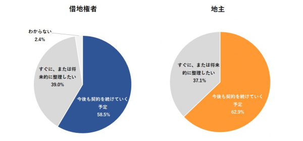 借地権者と地主とも現在の借地契約を継続していきたいかという「今後の契約ついての意向」を調査したところ、借地権者は58.5%、地主は62.9%が「今後も契約を続けていく予定」と回答した。