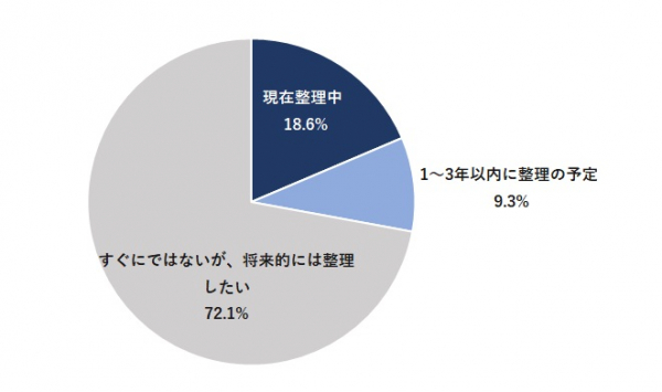 借地権者・地主で借地契約について「すぐに、または将来的に整理をしたい」と回答した方に対して、いつ頃に整理をしようと考えているかについて調査したところ、現在整理中(18.6%)、1〜3年以内に整理の予定(9.3%)となり、約3割の方が3年以内の整理を検討していることがわかった。