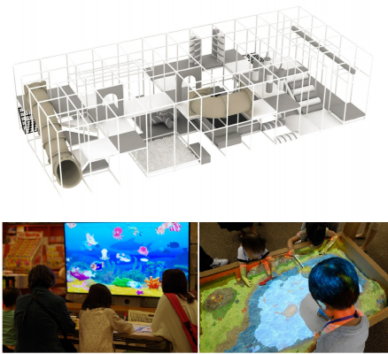 子どもたちが思いっきり「ウゴク」ことができる大型アスレチックや、「おえかきパラダイス」「ペイントすなば」(提供:日販コンピュータテクノロジイ)といった楽しみながら学べるツールを通して、子どものそうぞう(創造・想像)力を育みます。