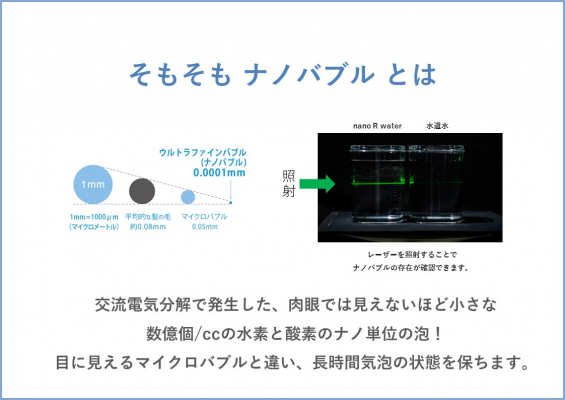 消えにくいナノバブル水素は長期間酸化を抑え、浸透力にも優れる健康に生きる飲料水です。
