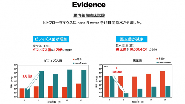 ヒトフローラマウスでの臨床試験の結果、nano R waterを飲水する事で飲水2日目に腸内のビフィズス菌が10,000倍に増加、また。悪玉菌が10,000分の1に減少。