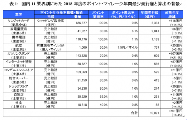 国内11業界の主要企業による2018年度のポイント・マイレージの最少発行額は、1兆21億円と推計され、その3分の2はクレジットカード会社、家電量販店、携帯電話事業者により発行されているとみられます。