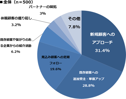 ⇒全体の31.4%が「新規顧客へのアプローチ」、28.8%が「既存顧客への追加受注・単価アップ」