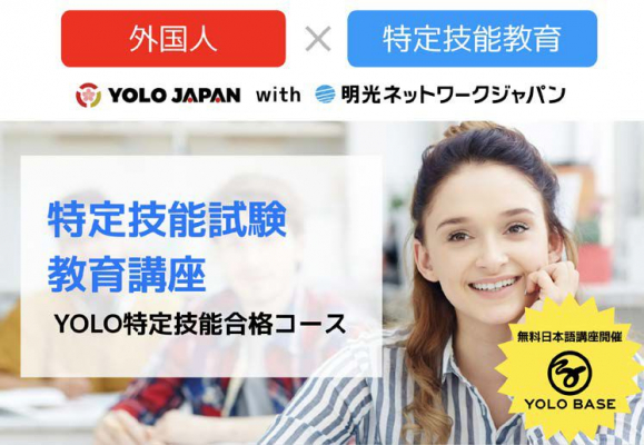 株式会社明光ネットワークジャパン(代表取締役:山下一仁、本社:東京都新宿区、以下、明光ネットワークジャパン)は、9月28日より、日本初の就労インバウンドトレーニング施設「YOLO BASE」を運営する、株式会社YOLO JAPAN(代表取締役:加地太祐、東京本社:東京都港区、以下「YOLO JAPAN」)と業務提携し、特定技能ビザの取得をめざす在留外国人向けにオンラインの日本語学習講座『YOLO特定技能合格コース』を提供することを発表いたします。