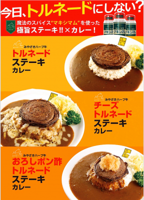 販売店:カレー倶楽部ルウ梅田店(大阪)、カレー倶楽部ルウ難波中店(大阪)カレー倶楽部ルウ守口店(大阪)、カレー倶楽部ルウ都城本店(宮崎)※清水寺二年坂店(京都)は日本式みやざきハーブ牛トルネードカツカレーの販売