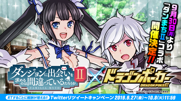 株式会社アソビズム(本社:東京都千代田区、代表取締役:大手智之)は、App Store・Google Playにて好評配信中のリアルタイム合体カードバトル『ドラゴンポーカー』で、2019年9月30日(月)よりTVアニメ『ダンジョンに出会いを求めるのは間違っているだろうかII』とのコラボイベントが開催いたします。