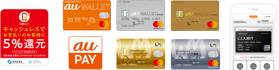 KDDIグループで「キャッシュレス・消費者還元事業」に参画する決済サービスは、「au PAY」「au WALLET プリペイドカード」「じぶん銀行スマホデビット」「au WALLET クレジットカード(ゴールドカード含む)」「WebMoneyプリペイドカード」「WebMoneyプリペイドカード Lite」となります。