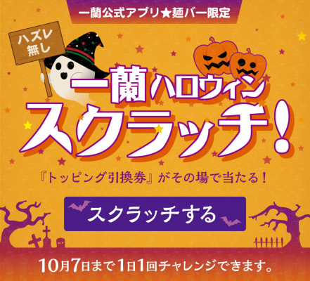 天然とんこつラーメン専門店一蘭を全国で展開する株式会社一蘭(創業:昭和35年/本社:福岡県福 岡市博多区/代表取締役社長:吉冨 学)では、10月1日(火)〜 7日(月)の7日間、一蘭公式アプリ 会員様限定で、「一蘭ハロウィンスクラッチ」を実施いたします。昨年も大変多くの方に楽しんでい ただいた一蘭の大人気企画。日頃ご愛顧くださっているアプリユーザーの方々に感謝を込めて、今年 もこちらのハロウィン企画をご用意いたしました。