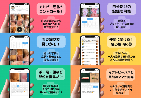 アトピヨは、文字だけでなく「画像」を投稿することで、アトピー特有の皮膚症状(状態)を匿名で記録・共有できる日本初のアプリです(2018年7月アトピヨ調べ。App Store・Google Playを調査)。画像は身体の部位ごとに時系列表示され、(1)症状記録の見える化(2)悩みや症状の共有ができます。アトピーを発症し悩んでいる方々の早期回復のサポートになることを目指しています。
