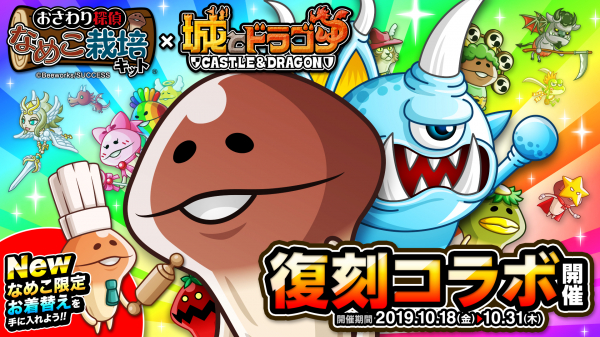 株式会社アソビズム(本社:東京都千代田区、代表取締役:大手智之)は、App Store・Google Playにて好評配信中の『城とドラゴン』で、2019年10月18日(金)より株式会社ビーワークスならびに株式会社サクセスの『おさわり探偵 なめこ栽培キット』(以下、『なめこ栽培キット』)との復刻コラボイベントを開催中です。