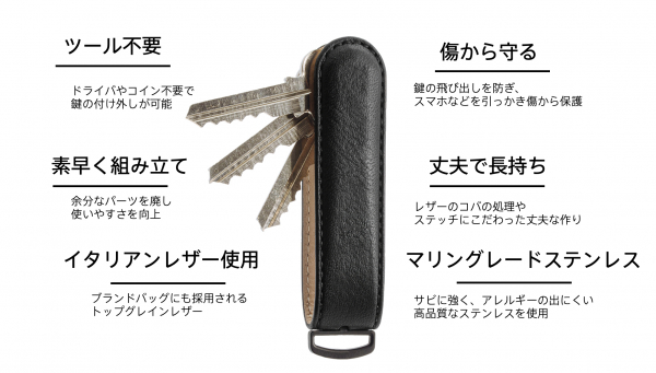 余分なパーツをなくし、シンプルに機能的に。JIBBONの開発コンセプトです。同じような形状のキーケースは他にもありますが、スペーサーやスプリングなどの調整パーツを使用している場合がほどんど。パーツが多くなるほど、仕組みは複雑になり、誰でも簡単に素早く使えるものではなくなってしまいます。