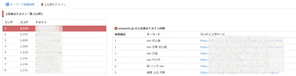 2) 入力したキーワードで上位表示されているドメインを一覧で表示します。