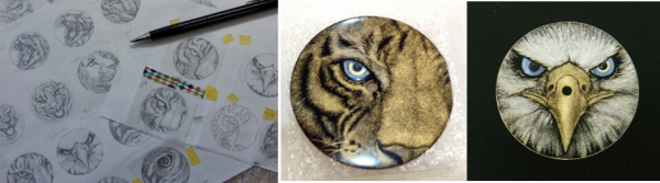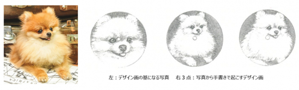 デザイン制作にあたっては、ペットなどの写真をご用意いただき、パソコンではなく、手書きでデザイン画を起こします。あえてパソコンを使わないのは、「人間の能力の方が優れているから」という北村工房のこだわりです。希望のデザインに合わせてプラチナや金、白蝶貝、夜光貝などの素材を使用して、高密度にリアルに表現いたします。見る角度によって光を照り返し、表情が変わるなど、写真以上の楽しみを味わえます。