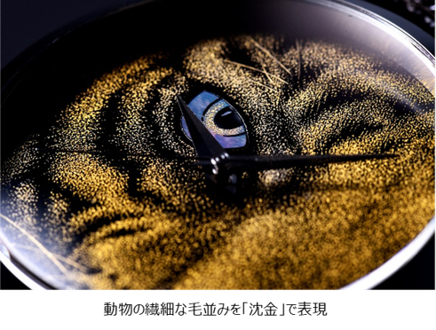 今回受注販売するのは、海外コレクターにも人気の高い輪島の漆芸家・北村辰夫氏が率いる北村工房が、大切なペットなどの写真からデザインを起こして文字盤を手作りしてくれる、世界でひとつのオーダーメード腕時計です。漆の装飾技法である沈金という漆面に文様を彫って、金箔や金粉、プラチナなどを入れて表現する技法を使って文字盤を作ります。沈金は、動物の毛並みなどが最も巧みに表現される技法です。一般的なペット関連商品とは違い、自身のペットをいつでも身に着けられる特別な逸品です。