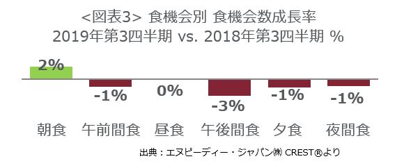 食機会別の食機会数成長率(図表3)をみると、朝食が+2%で、成長が続いている朝食のみが増加しました。
