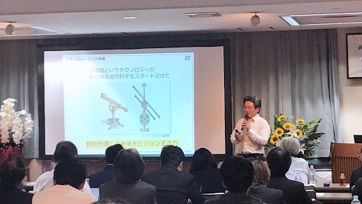 休憩を挟んで約2時間にわたる講義で福原は、「AIのインフラ技術としての将来性と影響力の凄さと、中小企業の活用戦略」と題して、囲碁AIの研究とともに始まった当社の独自開発の歩みを述べながら、その成果であるディープラーニング技術、画像認識技術がもたらす未来像について論じました。