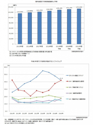 法人を対象としたアンケート調査においては、毎年、今後3年間でIT投資が増加するソフトウェアについて尋ね、回答を得ている。2019年調査(回答社数482社、最大3つまで複数選択可能)では「ERP(基幹業務統合管理)」が41.9%で8年ぶりにトップに立ち、これまでトップであった「セキュリティ関連ソフトウェア」と同率1位となった。ERPがトップになった背景には、経営環境の変化にあわせて基幹システムを更新する動きが進んでいることや、ERPパッケージのクラウド化が進んでいること、SAPのERP保守サポート期限が2025年に迫っていることなどがあると考える。
