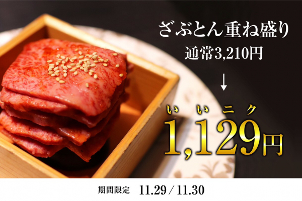 尾崎牛を専門とした高級焼肉店『渋谷焼肉ざぶとん』では、11月29日(金)と30日(土)の2日間限定で“いい肉の日”にちなみ、通常3,210円(税抜)で提供している「ざぶとん重ね盛り」を当日に限り1,129円で提供いたします。