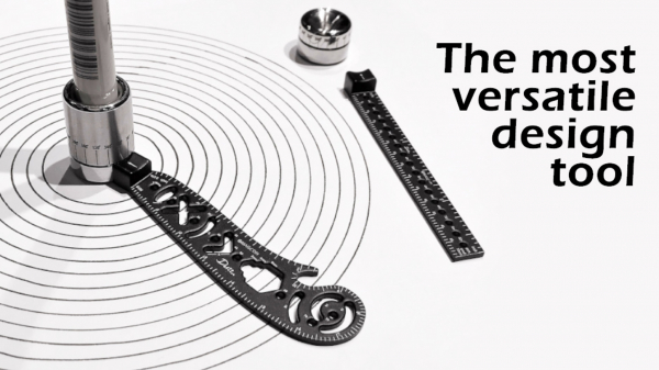 ジュラルミンで作られたルーラーは適度な重さがあり、安定した描画を可能にします。また、伝統的なコンパスを再発明し、4mm間隔の半径16mm〜80mmの円を描けます。今までのコンパスのように針がないので紙に穴を開けずに済み、正確に円を描写できます。