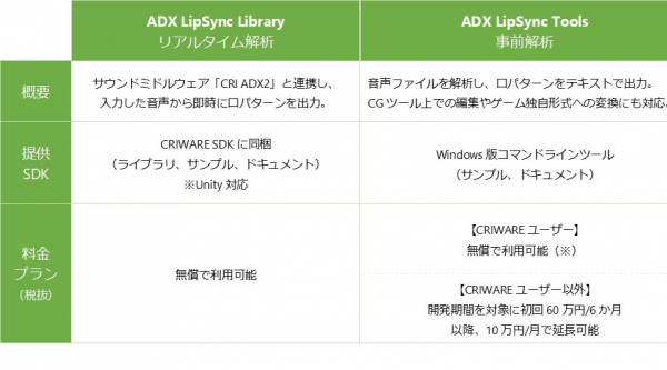 ADX LipSyncは、機能やCRIのミドルウェア製品群「CRIWARE」の利用状況に応じて提供内容やライセンスプランが異なります。CRIWAREユーザー向けにはリアルタイム解析及び事前解析の両機能を無償で提供いたします(※)。CRIWAREユーザー以外の利用者向けには、事前解析機能を開発期間を対象に初回60万円/6か月(税抜)にて提供いたします。継続して利用する場合には10万円/月(税抜)にて延長することが可能です。