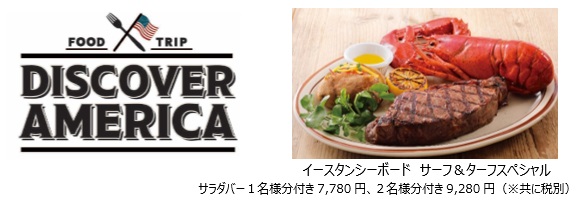 来店いただく全てのお客様に「ディスカバーアメリカフェア」を体験していただきたいとの思いから、プレミアムサラダバーにも「ディスカバーアメリカフェア」のメニューをご用意しました。第一弾はサラダ2品、スープ、ビスケット、デザートがラインナップ。グリル料理をご注文頂くと、前菜からメイン、デザートまでフルコースで「ディスカバーアメリカフェア」をお楽しみいただけます。