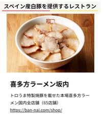 株式会社麺食(本社:東京都大田区、代表取締役社長:中原誠)がFC事業展開する「喜多方ラーメン坂内」は、スペイン大使館が2019年12月15日まで実施している「スペインポークを食べて、スペイン旅行を当てよう!」のキャンペーンサイトにて、ラーメンの焼豚にスペイン産白豚を提供する店舗としてメニューが紹介されています。