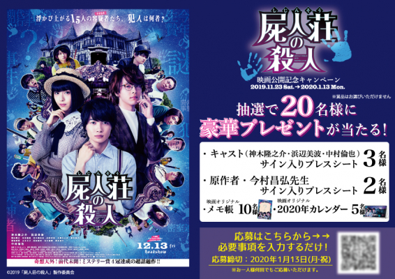 内容:実施店舗に掲示されたポスター・POPに記載のQRコードより、応募サイトにアクセスしてご応募いただくと、抽選で映画「屍人荘の殺人」オリジナルグッズなどの豪華賞品が当たります。どなたでも何回でもご応募いただけます。