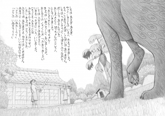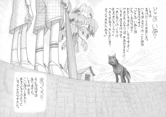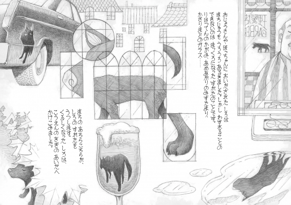 この絵本の著者、田中伸介氏は、この作品を鉛筆のみで描いており、また文字部分はボールペンを使用し手書きで仕上げました。繊細でダイナミックな線画が織りなす、表情・模様・目線・風景……細部にわたる表現が、「しろ」のこころ模様を色濃く映し出しており、非常に味わいの深い一冊です。