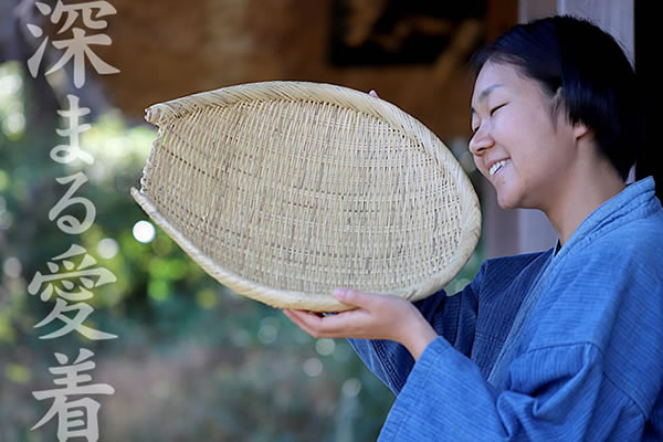 細身でしなりのあるスズ竹は、竹の中でも抜群の耐久性を持った非常に丈夫な素材です。更に水にも強いので、行李や市場カゴ、文庫、そばざる、椀かごなど様々な生活用品に重宝されてきました。使い込むほどに飴色へと変化する自然素材ならではの魅力も持ち、ますます愛着が深まり手放せなくなる逸品となります。