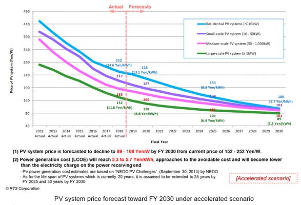 On the premise of forecasting installed capacity, the top runner prices of residential and industrial PV systems will continue to drop greatly reflecting the international price level. The PV system price is 152 to 252 Yen/W as of today but is estimated to reduce to 89 to 108 Yen/W by FY 2030 under the “accelerated scenario”. The estimated levelized cost of electricity (LCOE) is already 11.8 to 14.6 Yen/kWh as of today, which is cheaper than the grid electricity. Furthermore, the price is estimated to decrease to almost the level of avoidable cost, 5.3 to 5.7 Yen/kWh by FY 2030.