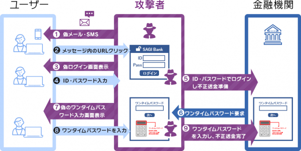 (9) 攻撃者は詐取したワンタイムパスワードで、有効時間の間に素早く送金操作を完了(図1)