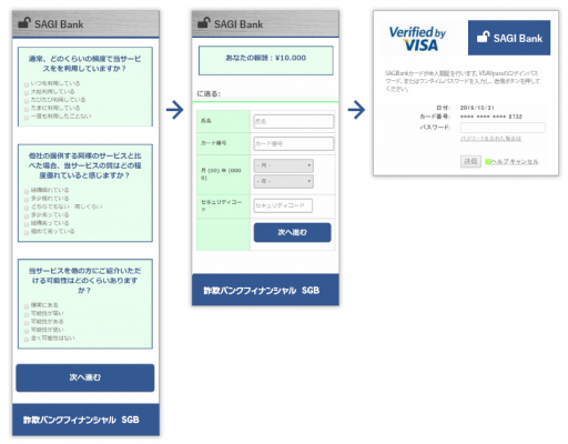 金融機関を装った「アンケート協力で¥10,000の報酬が受け取れる」という内容が記載された偽メールが届きます。リンク先を開くと、ごく普通の利用者アンケート画面が表示され利用者を安心させます。アンケートが終了すると、報酬の受け取りのためにクレジットカード番号やパスワードを入力させる画面が表示され、情報を詐取する手口です。不正ログインに関する注意や警告によるフィッシング詐欺とは異なるため、利用者が警戒を解いてだまされてしまう可能性があります。