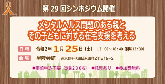 子ども虐待防止「オレンジリボン運動」の総合窓口を担うNPO法人児童虐待防止全国ネットワーク(所在地:東京都世田谷区、理事長吉田恒雄)は、令和2年1月25日(土)、星陵会館(東京都千代田区)において、シンポジウム「メンタルヘルス問題のある親とその子どもに対する支援を考える」をテーマに掲げ、開催します。
