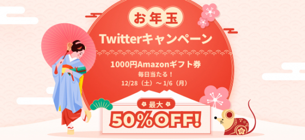 【年末年始大感謝祭】お年玉Twitterキャンペーン !Amazonギフト券1,000円が毎日3名様に当たる!超特価人気製品×5種!最大50%OFF!