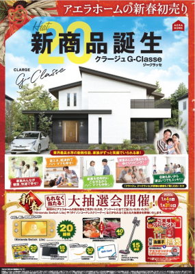 今回の「クラージュ G-Classe」販売開始を記念して、アエラホームでは一部パートナー店舗を除いて、モデルハウスにご見学いただいたお客様を対象に、「 Nintendo Switch Lite 20組様」や「ダイソンコードレスクリーナー 15組様」など豪華景品があたる『もれなく当たる大抽選会』を実施いたします。さらに、各支店先着20組様には「特製お菓子福袋」「アエラオリジナルUFOバルーン」をプレゼントする特別キャンペーンも同時開催いたします。