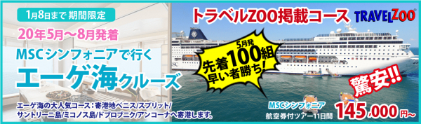 株式会社ベストワンドットコム(本社:東京都新宿区、代表取締役社長:澤田秀太)は、2019年12月25日のトラベルズーにて、「MSCシンフォニア号で行くエーゲ海・アドリア海クルーズ 11日間」のツアーを発表し、予約受付を開始いたしました。2020年1月8日までの期間限定販売になります。