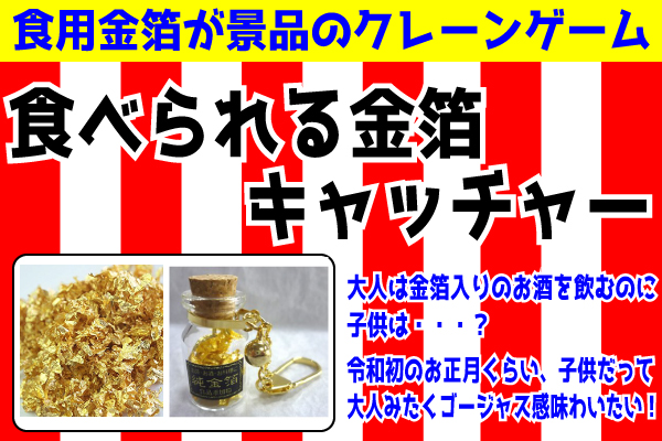 そんな中、『大人は、金箔入りのお酒を飲んだりするけれど、子供は?』という疑問を抱き、子供だって、令和初のお正月くらい、ゴージャスな気分を味わってみたいのでは?と思い、景品額が高額になってしまうので、決して、多い量ではありませんが、小瓶に少量の食用金箔が入った物を景品に採用し、お子様にも、ゴージャスな気分が味わってもらえる【食べられる金箔キャッチャー】が誕生しました。