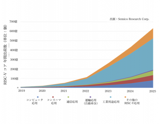 自動車業界の電子化へ関心は高く、安全性、車内体験、運転者支援、無線通信のためのCPUベースのシステム採用が増えており、輸送機器がで2番目に年間成長率の高いRISC-V CPUコア応用セグメントとしています。下図にSemico Research社が発表したRISC-Vコアの年間出荷数値のグラフを紹介します(出展: Semico Research Inc. 和訳: RISC-V協会)