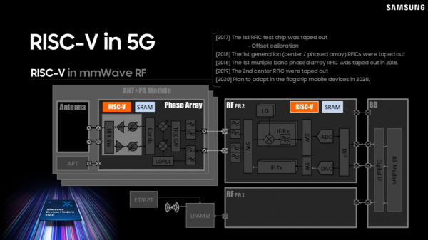 サムスン電子は、2017年に「5G」RF IC試験チップをRISC-Vで試作。2018年にアンテナ + PAモジュール用「5G」マルチバンドフェーズドアレイRFICにRISC-Vで試作、2019年に、セントラル「5G」RF ICをRISC-Vで試作し、技術開発を積み重ねて今回の発表にこぎつけたとのことです。