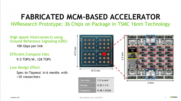 RISC-Vを使用したNVIDIAのRC18深層学習推論アクセラレータを下図に示します。36個のチップ(2.4mm x 2.5mm)をマルチチップモジュール(MCM = 47.5mm x 47.5mm)に実装しています。100 Gbpsの通信速度を持つ高速の相互接続と高電力性能計算タイルを16個ずつTSMC 16nmテクノロジーで製造し、これら36個のチップをMCMに実装し0.52Vから1.1Vで駆動、0.48-1.8GHzで動作させます。9.5テラオペレーション/ ワットの電力効率で、1ユニットで毎秒128テラオペレーションの演算能力を実現します。